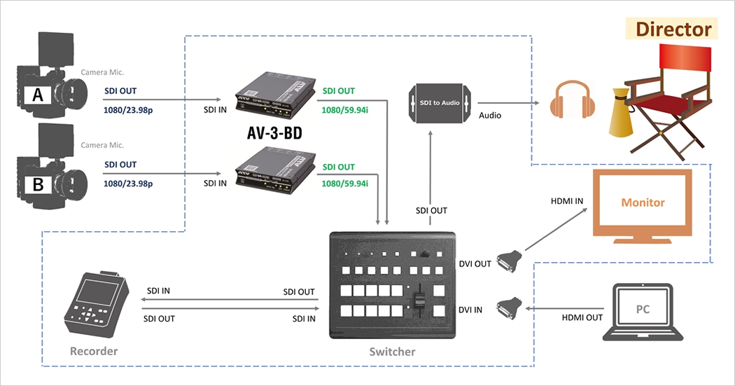 Compact, lightweight, and immediately ready to work! Adopting the AV-3-BD as part of a monitor switcher system for use on location
